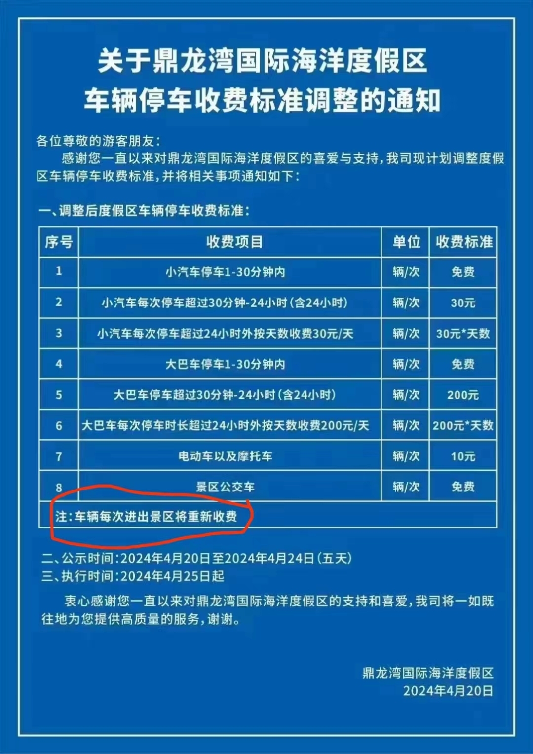 “2024年4月25日调整景区停车费前,是以进入景区的车辆超过半小时,按10元/次收费,停一天收30元的;调整后,现进入景区的车辆超过半小时,则按30元/次收费。鼎龙方规定,每套房或每幢别墅,除一辆车可登记免停车费外,家庭其他成员的车都需照交停车费!这样一来,业主或游客到外面办事或用餐时,一天出入景区几次就得交上百元的停车费!生意不景气,试图靠停车费的收入来补贴,此举非常愚蠢,是得不偿失的!”鼎龙的多名业主和游客在接受记者采访时,显得异常气愤,并称:景区调整停车收费后,近段时间的客源较往年同期已明显减少,“尽管住宿费比往年低,但许多客人说起这停车费时均摇头,觉得收费着实太离谱了!”多家经营旅游度假酒店的商家说。