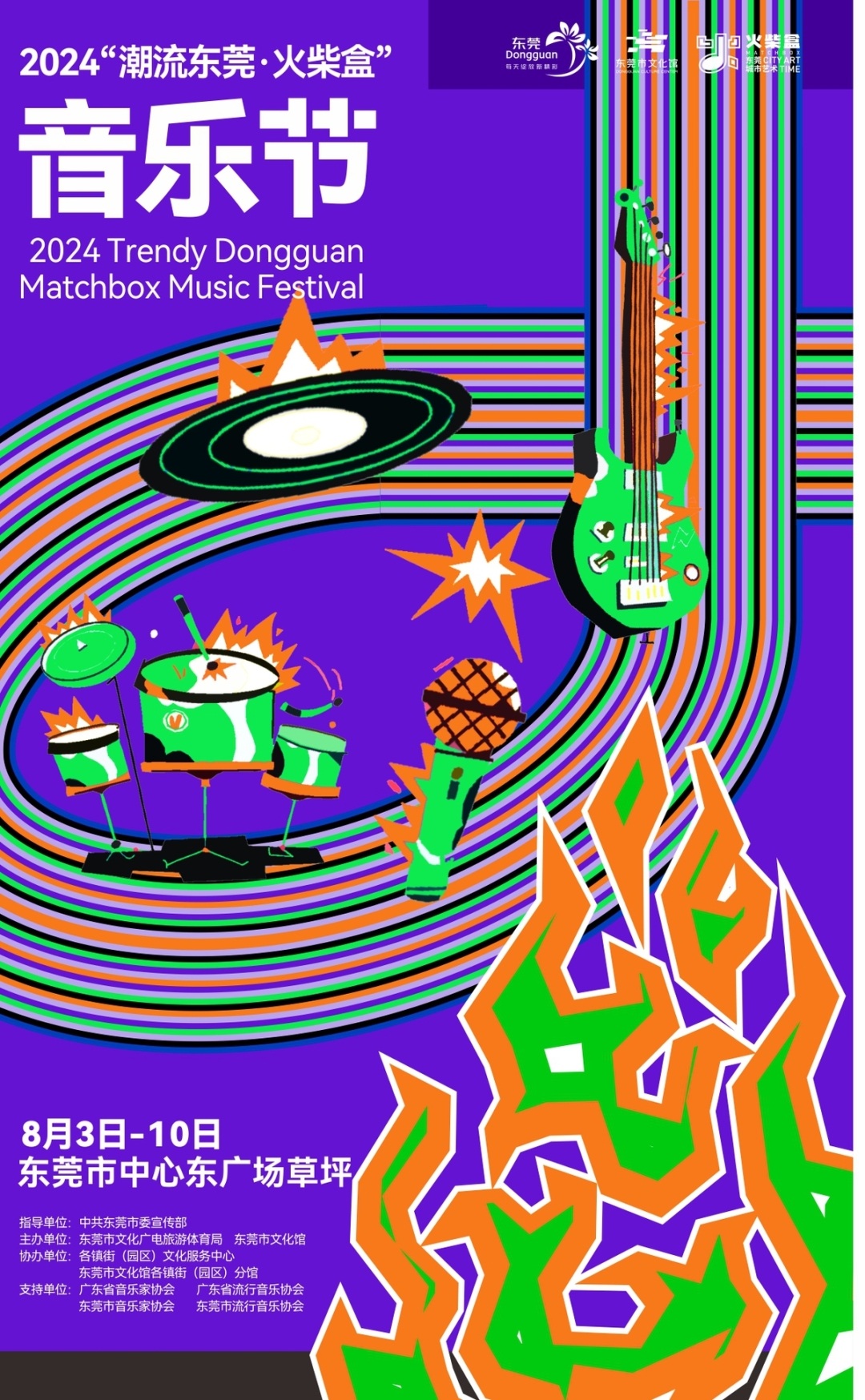 2024年东莞火柴盒音乐节将从8月3日持续到8月10日。期间,每晚8点,在东莞行政中心广场莞香印巷东草坪主会场将举办包括脚信号&甲番乐队演唱会、粤港澳大学生乐队演唱会、“太阳之子”演唱会、说唱联盟音乐派、KPS舞团青春派、李高阳爵士音乐会、“劲歌金曲”粤语流行歌曲演唱会等8场重磅主题音乐演出。