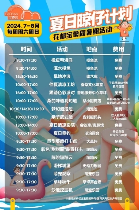 “宝桑园夏日晾仔计划”来啦!6月最后一个周末正式启动,直击快乐巅峰!水上狂欢乐趣无穷!来吧,跳进橡皮鸭的海洋,体验旱地冲浪的快感,浑水摸鱼的乐趣,在梦幻泡泡池里尽情嬉戏,还有踢踏色彩派对,让夏日酷爽升级!