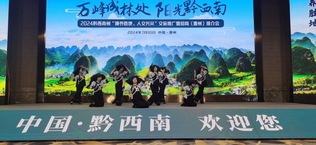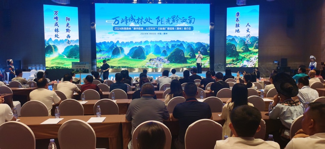 7月10日,惠州市举行2024黔西南州城市营销暨文旅游推介会。黔西南州各县(市)文创产品展示、快闪活动等向惠州市民展示了黔西南夏季旅游的特色和玩法。