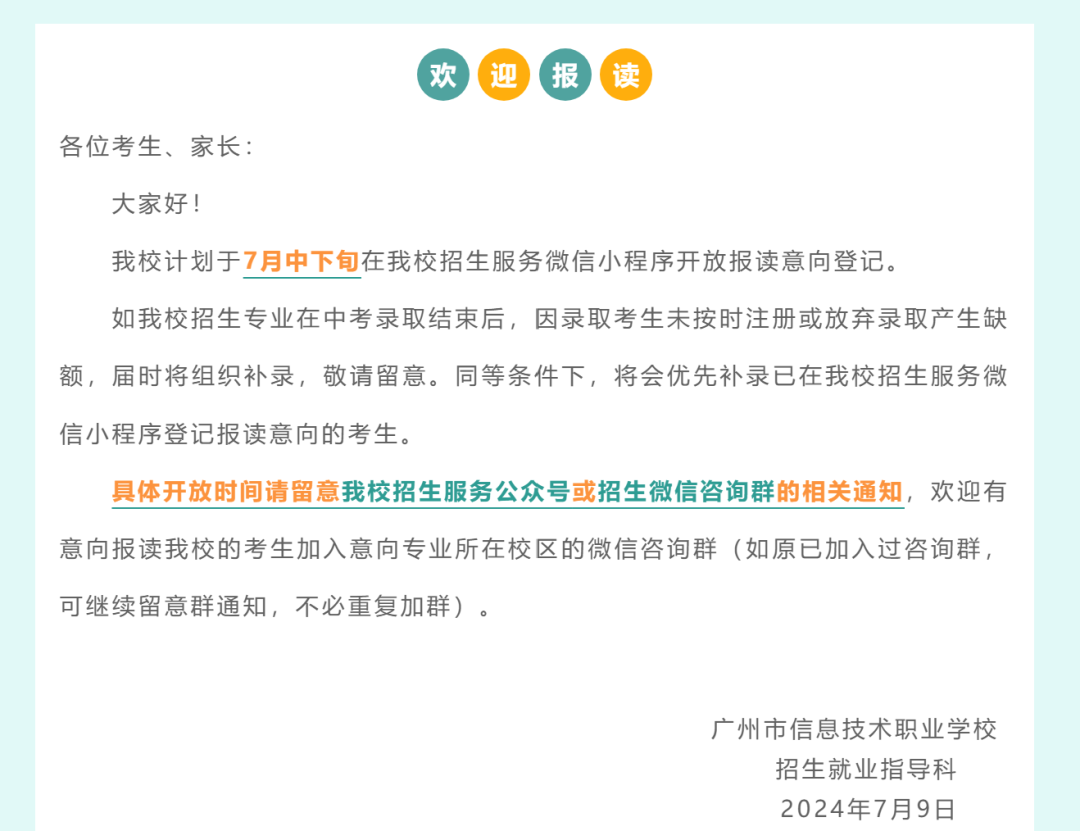 广州市信息技术职业学校发布通告表示,计划于7月中下旬在学校招生服务微信小程序开放报读意向登记。如学校招生专业在中考录取结束后,因录取考生未按时注册或放弃录取产生缺额,届时将组织补录,敬请留意。同等条件下,将会优先补录已在学校招生服务微信小程序登记报读意向的考生。