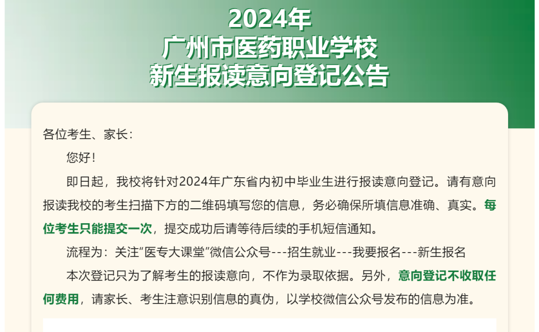 即日起,广州市医药职业学校将针对2024年广东省内初中毕业生进行报读意向登记。请有意向报读该校的考生,关注学校官微找到相关页面填写信息,务必确保所填信息准确、真实。每位考生只能提交一次,提交成功后请等待后续的手机短信通知。学校称,本次登记只为了解考生的报读意向,不作为录取依据。另外,意向登记不收取任何费用,请家长、考生注意识别信息的真伪。