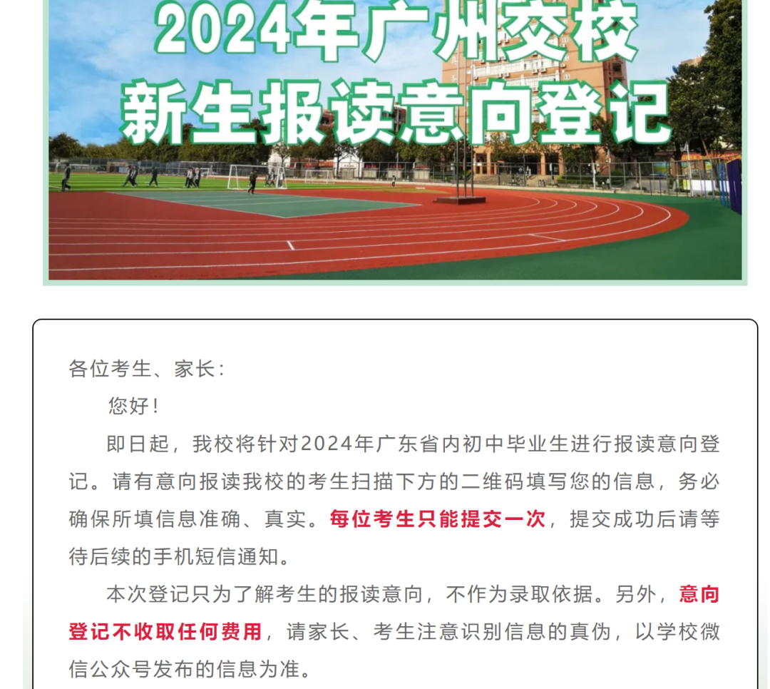 该校表示,本次登记只为了解考生的报读意向,不作为录取依据。另外,意向登记不收取任何费用,请家长、考生注意识别信息的真伪。