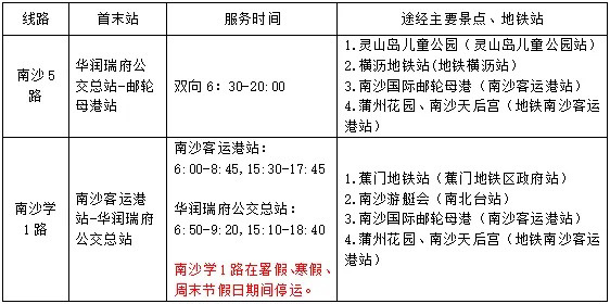 据介绍,华润瑞府公交总站位于灵山岛凤凰大道西侧华润瑞府小区,周边分布有住宅小区十余个,是岛上居民生活集中的区域。该站场引入南沙5路和南沙学1路2条公交线路。2条线路分别连接横沥地铁站和蕉门地铁站,为周边十余个小区居民通勤出行提供便利。线路营运服务信息如下: