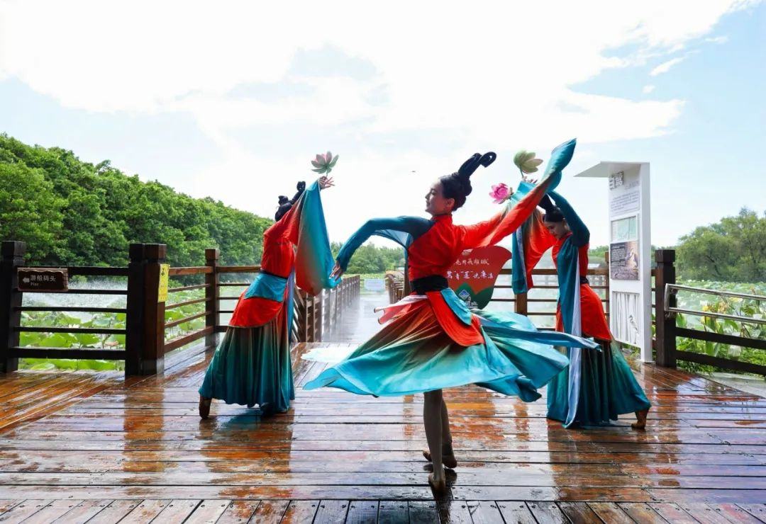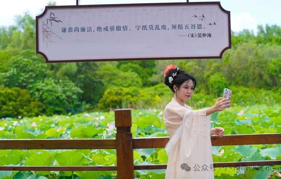 与往年荷花节开幕式有所不同,7月11日荷花节开幕式当天上午10:40—11:00,在南沙湿地九曲荷花池举行荷花仙子舞蹈表演、乐器演奏、书法互动和古风走秀等表演内容,让游客漫步荷香中细品清廉文化,欣赏古风表演。
