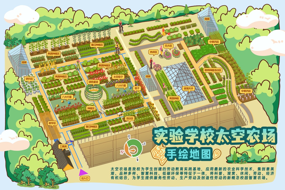太空农场占地2960平方米,经过学校精心的规划和设计,科学地划分为八个区域,分别是:工具房、科创区、种子研究区、果蔬种植区、主题区、学科融合区、花卉区、中草药区。在农场内,学校设置了超过60个种植槽,每个班级均分配有相应的种植槽区域。