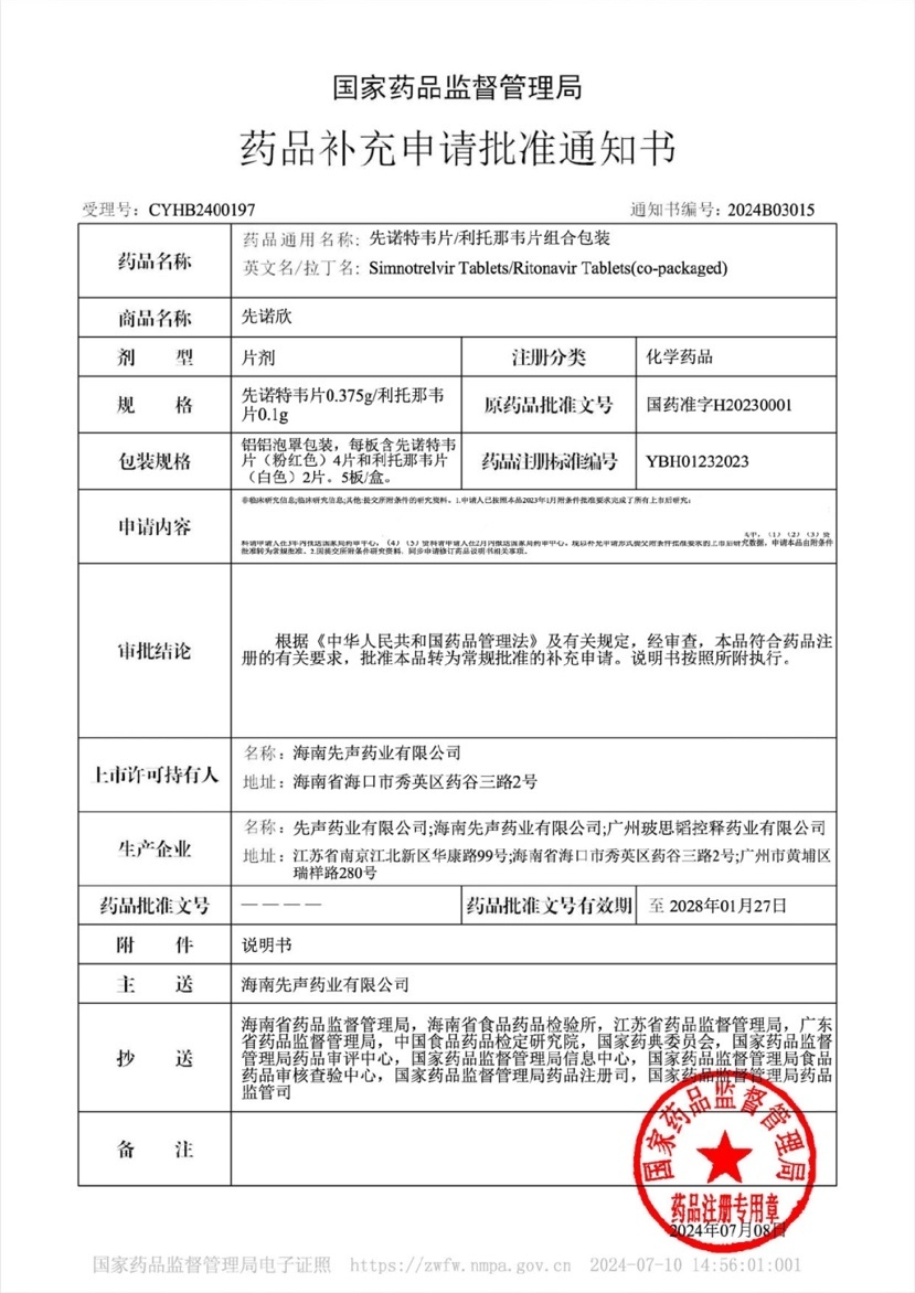 据悉,此次先诺欣®完全获批后,未来感染者有望通过更多渠道便捷获得药品,在新冠治疗“黄金72小时”内尽快实现抗病毒用药,以缩短病程、减轻症状并降低危重症风险。