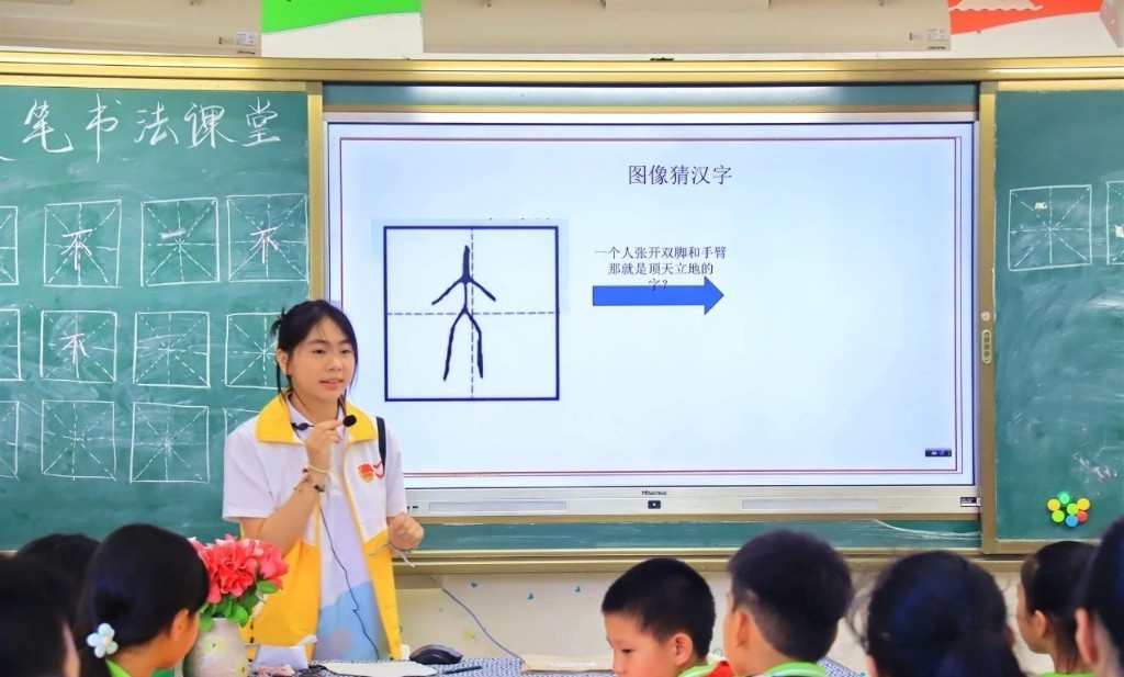 “同学们,这个像一个小人顶天立地模样的是什么字啊?”在良口镇第二小学的“乡村少年宫”,来自广州南方学院的志愿者们为孩子们带来了首节精彩的书法课。课堂上,老师们细致入微,先从看图识字等互动游戏调动少年儿童的积极性与主动性,带领着孩子进入状态,随后,老师们从坐姿、握笔姿势等逐一进行耐心讲解,并下笔示范。孩子们个个挺直小身板,一笔一画临摹练习。