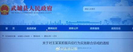 近日,记者从山东省德州市武城县人民政府网站了解到,一名男子因为拒服兵役被部队除名处分,并按规定给予联合惩戒。网站通过发布《关于对王某某拒服兵役行为实施联合惩戒的通报》,向社会通报相关情况。原文如下: