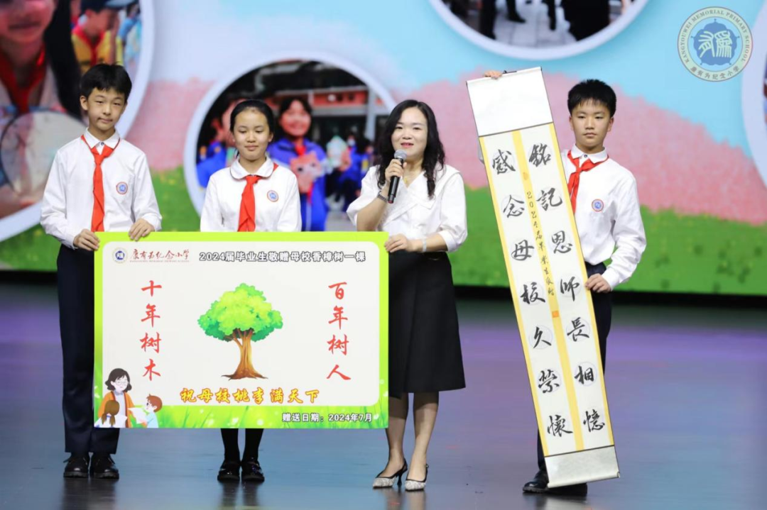 2024届全体毕业生还向母校赠送一棵香樟树,为母校增添一份生机。校长罗倩雯表示,这棵树将种在校园里,树牌上的二维码将记录2024届孩子们和这课树的故事,她相信这棵树枝繁叶茂的那一天,同学们也会在各行各业“结下”累累硕果。