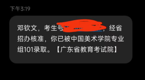 据悉,进入术科学习以来,邓钦文专业功底突出,文化课方面同样表现优异。早在此前,他已连续在佛二模和顺三模中获得好成绩,展现了他全面均衡的文化素养。随后,他在联考中斩获美术专业的高分,校考更是以优异成绩在中国美术学院设计类名列前茅。