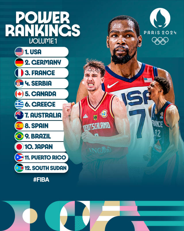 约基奇领军的塞尔维亚男篮实力榜第四,亚历山大领衔的加拿大男篮实力榜第五,字母哥领军的希腊男篮实力榜第六,澳大利亚男篮、西班牙男篮与巴西男篮分列实力榜第七至第九,日本男篮实力榜第十,力压波多黎各男篮与南苏丹男篮。
