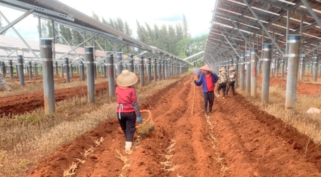 湛江农垦五一农场在光伏板下种植良姜已累计有1200亩,对外承包板下种植良姜、菠萝等作物的面积累计有510亩。因光伏板下空间种植属于光伏地再利用,农场经营可不计地租成本,且大行间仍可实现机械化作业,耕作上与空地基本一致,光伏板对耕作效率和管理成本影响较小。按现市场行情,平均收益预计达到年增收700元/亩,对外承包土地收益达到年增收200元/亩,大大提升了光伏板下的土地效益。