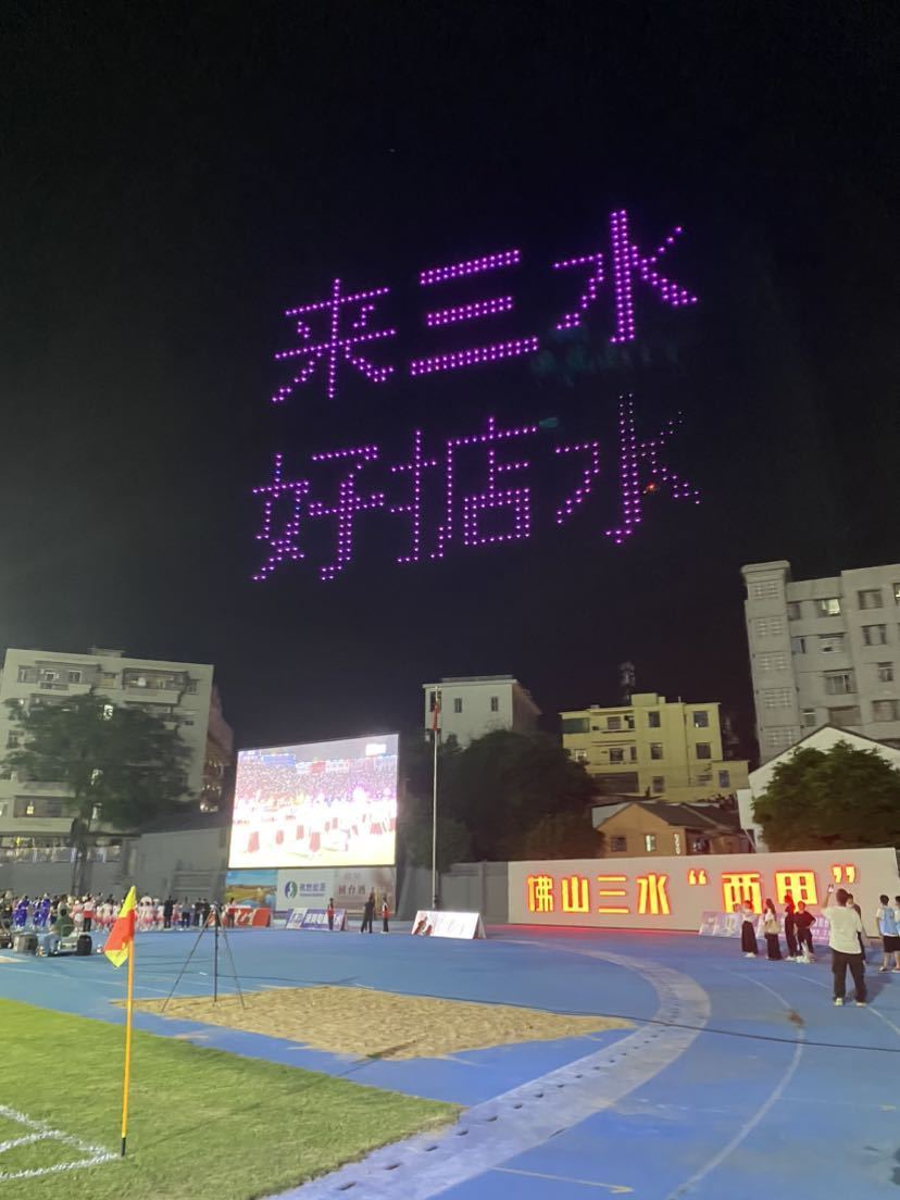 进入“中国魔水之夜”时间,500台无人机飞跃上空变换各种造型,展示健力宝发展历程。此外,歌手与乐队巡游车演奏、舞蹈演员热舞、打鼓表演、百人吉他弹唱《不再犹豫》等表演轮番上演,点燃球场氛围。此外,还有无人机在观众区派送健力宝小礼品。