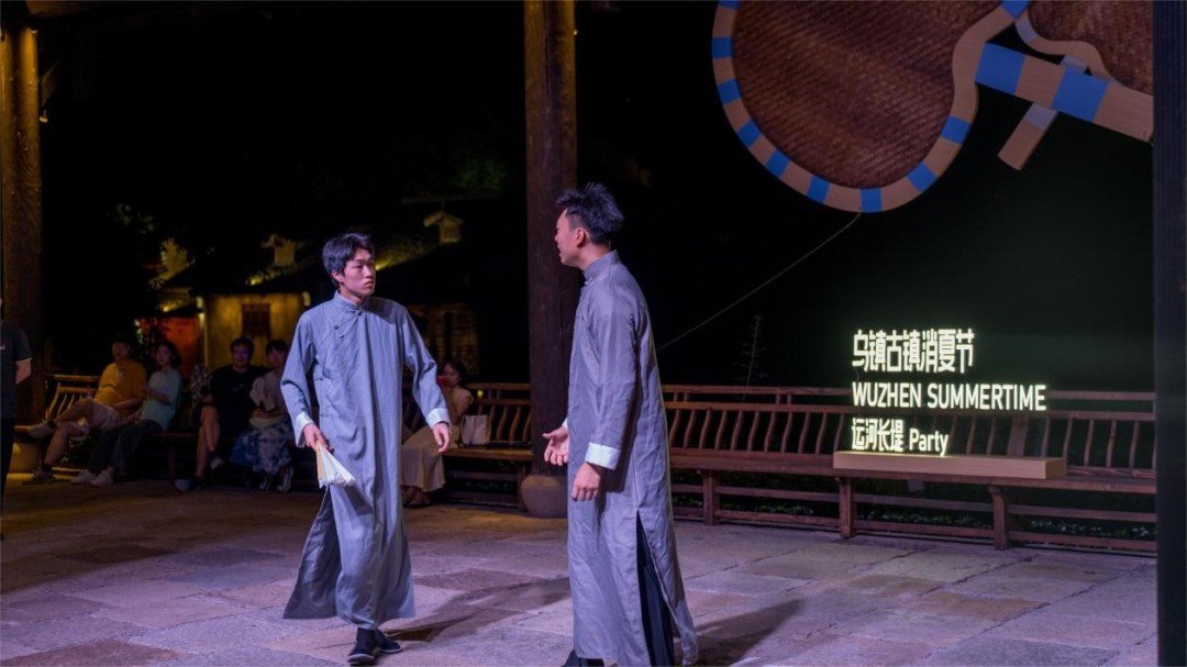 在被誉为“乌镇维多利亚港”的码头区域,主办方特设“码头有戏”系列活动,舞蹈、戏剧、歌曲、相声演绎会轮番上演。人们亦可在“落日电影派对”观看经典电影,吹着运河畔习习晚风,享受独特的观影体验。电影爱好者还可以参与现场电影台词互动。行至附近的“微醺埠”,特色餐饮、音乐派对、微醺KTV以及“我爱记歌词”互动游戏也让人流连忘返。