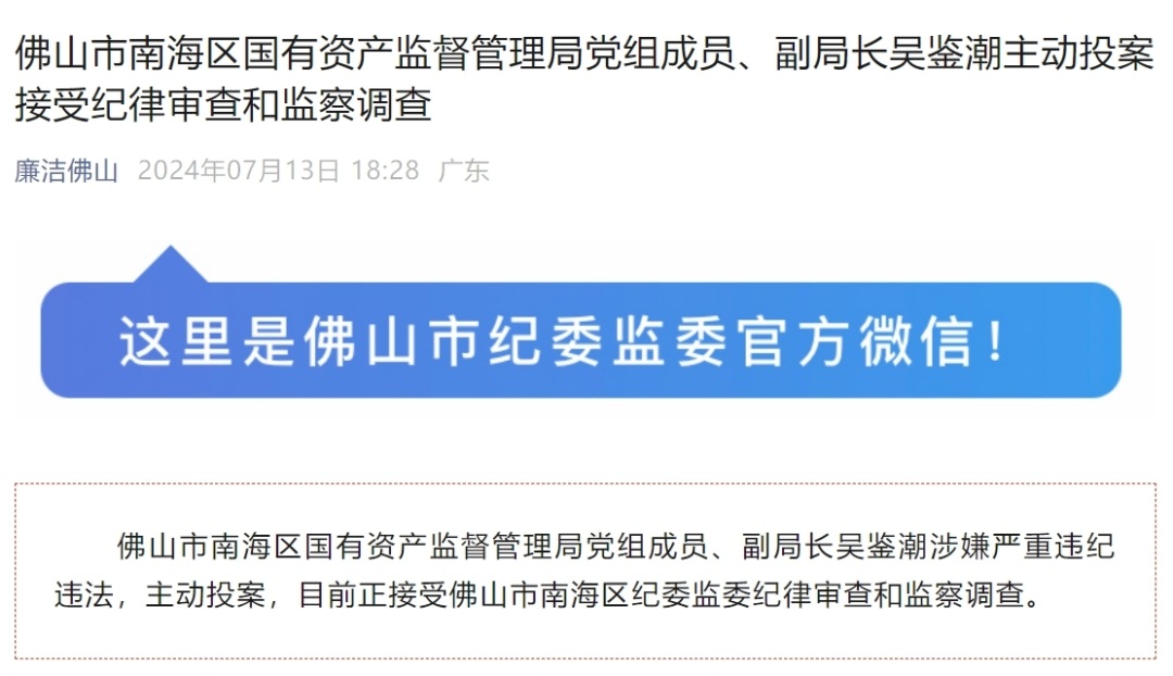 据廉洁佛山,佛山市南海区国有资产监督管理局党组成员、副局长吴鉴潮涉嫌严重违纪违法,主动投案,目前正接受佛山市南海区纪委监委纪律审查和监察调查。