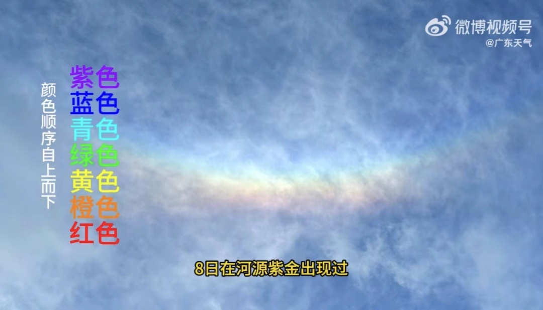 从视频可以看到,环地平弧的颜色顺序,从上到下依次是红色、橙色、黄色、绿色、青色、蓝色和紫色。而被称为“倒挂彩虹”的环天顶弧,其颜色顺序正好反过来。气象部门解释说,环地平弧和环天顶弧都是冰晕现象,要看到它们,需要有卷云,要卷云里冰晶足够多,还要特定角度的太阳光照射。不同的是,环地平弧需要太阳高度大于58°,网友“@带刺玫瑰--”拍摄时太阳高度约为70°,而环天顶弧需要太阳高度小于32°。正因为需要的太阳高度不同,所以环地平弧比环天顶弧更罕见,拍到它可谓幸运加倍。