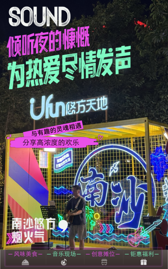 除了全民歌手大赛和帐篷音乐节外,南沙区内的商圈、景区在这周末同样精彩……南沙悠方天地办起了露天电影节、音乐节,开启了奇妙的光影与音乐之旅;南沙天后宫则打造了天后墟,伴着悦耳歌声,尽享露营和趁墟夜游的乐趣。