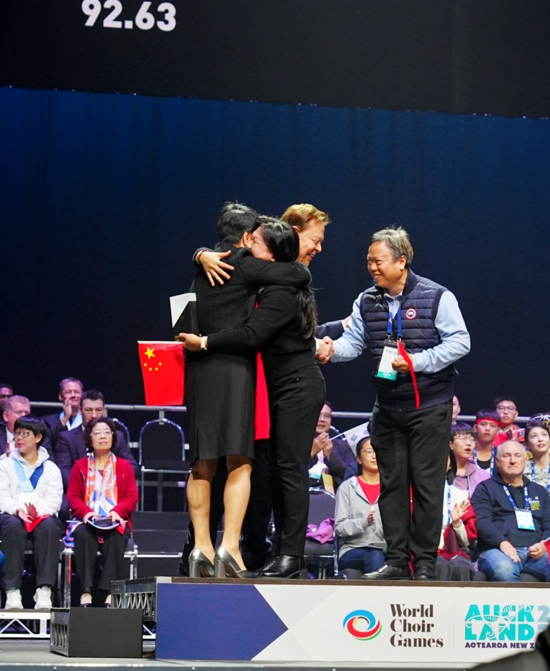 颁奖典礼上,当主持人宣布小云雀合唱团获得童声组最高分时,团员们高兴地欢呼、拥抱,流下激动的泪水;当国旗冉冉升起的时候,孩子们的民族自豪感不禁油然而生,深深为祖国感到骄傲与自豪。