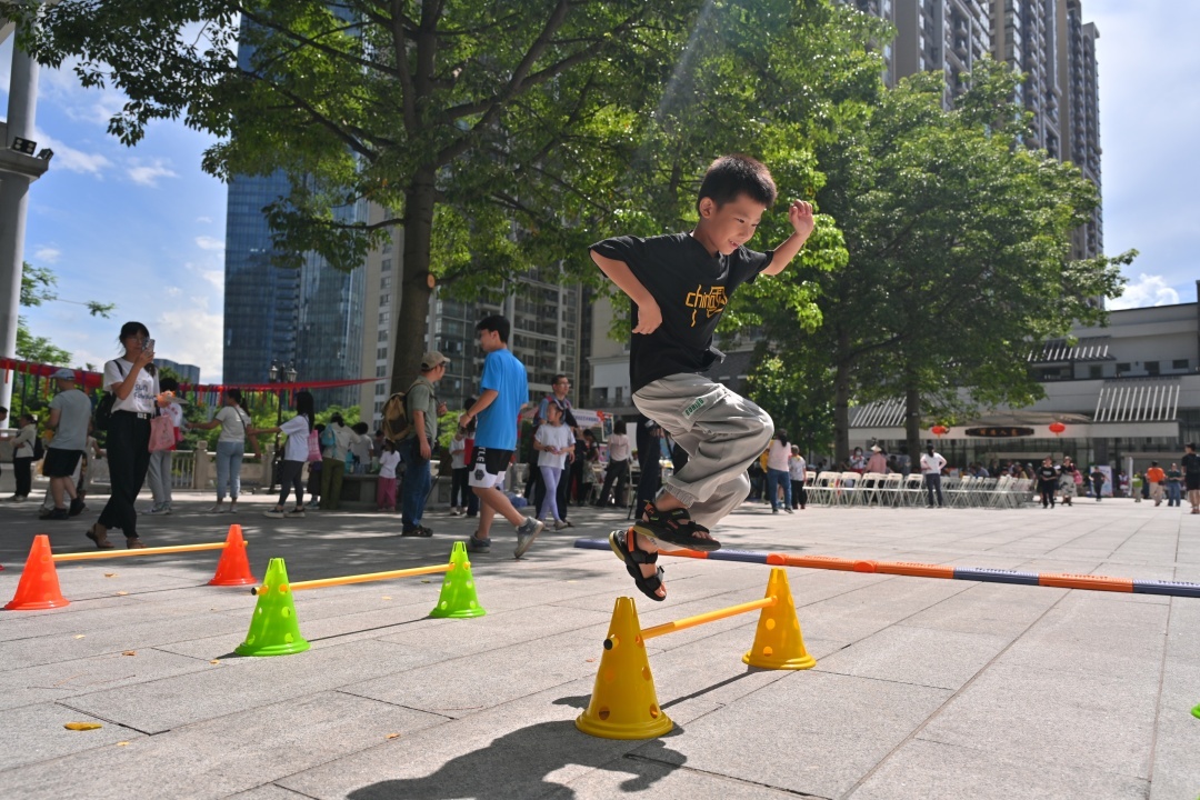 在祠堂外广场,趣味横生的体育课堂也成为孩子们释放活力的乐园。体育老师带领孩子们一起运动,在互动游戏中培养合作精神,体会运动乐趣。而在公益市集上,居民们沉浸在各种趣味体验活动中,如体验孤独症辅助训练功能游戏《星星生活乐园》、开展暑期安全自护宣传主题活动和进行慈善义卖等等。