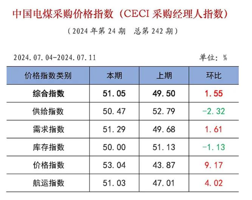 电价波动的传导作用对工业品和消费品价格可能产生中长期影响。电力负荷攀高,会让电煤供需出现不确定性因素。根据中国电力企业联合会发布的中国电煤采购价格指数,7月4日—7月11日的综合指数达到51.05%,环比提高了1.55个百分点,站上50%的荣枯分界线以上,显示电煤市场处于扩张区间。