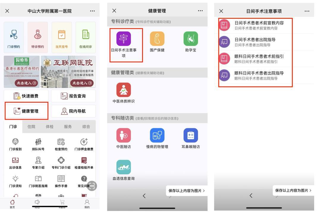 患者根据预约时间前往医院,关注中山一院日间手术中心公众号,了解手术相关注意事项,如携门诊病历、身份证、诊疗卡到日间手术中心等;