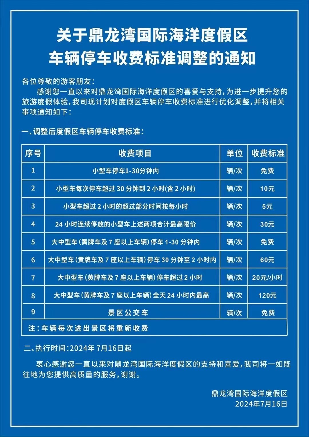 7月16日实施的鼎龙湾景区停车收费表