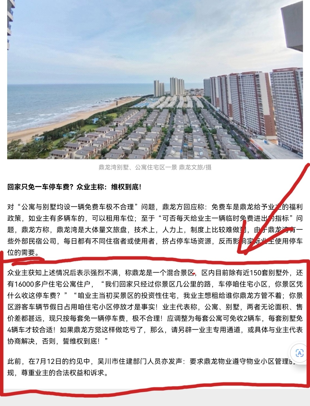 “广东鼎龙湾是一个混合景区,区内目前除有近150套别墅外,还有16000多户住宅公寓住户,一些问题尤其是涉民生问题如果处理不好,就会激化业主与景区方的矛盾,处理并管理好了,于全国而言,都很有借鉴意义!”吴川多个职能部门的负责人表示,他们都有看到了广州日报新花城客户端、大湾区头条视频号以及广东电视台等媒体对鼎龙湾景区因收费问题引发的争议的相关报道,也特别留意到了广州日报“追踪②”报道中,业主对鼎龙方目前实行的“公寓与别墅均设一辆免费车,认为极不合理,誓言将维权到底”的问题,并表示将加大协商和监管力度,尽力维护公平正义,“同时,希望鼎龙方多与业主、商家沟通,认真倾听民意,遵守物业小区管理的法规,尊重业主的合法权益和诉求,共促当地经济的发展”。