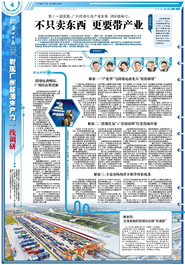 “我原本在上海从事互联网行业,2021年转行来到广州创业做跨境电商。我们依托广东广州优质产业带基础,打造了‘粤贸甄选’线上平台,帮助跨境电商卖家解决选品难和合规问题。”广东粤贸全球科技有限公司董事长陈刚向调研团队分享了他的创业经历。在他看来,广州“跨境电商+产业带”优势明显,希音、TEMU等全平台跨境电商产业带大多汇集在此,商机无限。