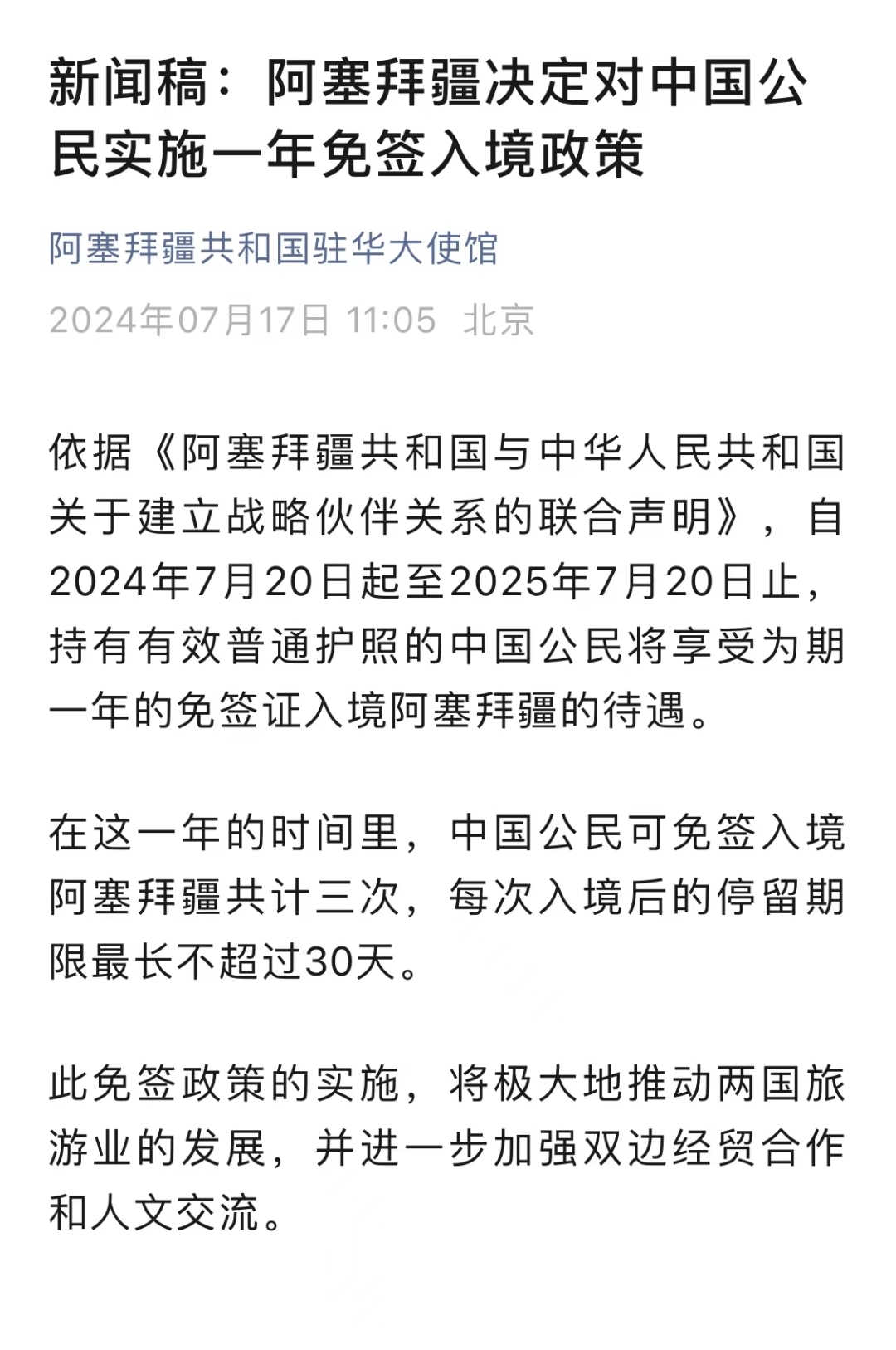 记者从“阿塞拜疆共和国驻华大使馆”官方微信公众号获悉,依据《阿塞拜疆共和国与中华人民共和国关于建立战略伙伴关系的联合声明》,自2024年7月20日起至2025年7月20日止,持有有效普通护照的中国公民将享受为期一年的免签证入境阿塞拜疆的待遇。
