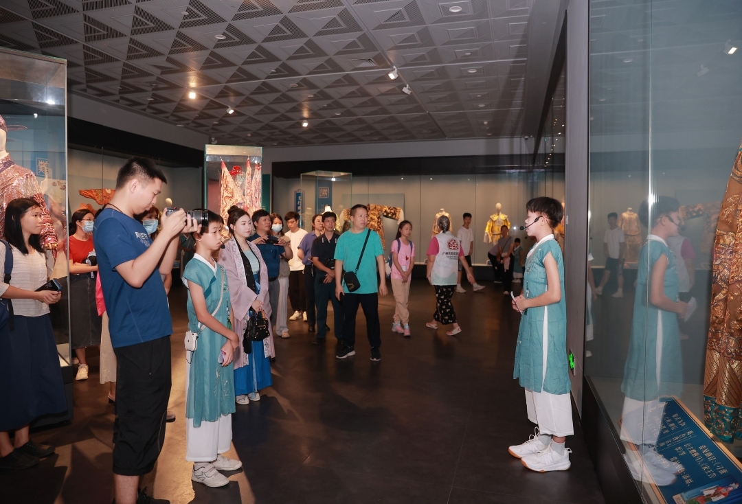 暑假刚刚开始,7月16日,广州市文化馆中心阁一楼特展厅“金翠迷离——粤剧传统服饰展”上,就多了一群身着汉服、说着粤语的青少年。他们是广州市文化馆首批青少年粤语导赏志愿“小馆员”。在古风扑面的戏服展厅中,流利轻快的粤语响起,为游客绘声绘色地介绍起戏服的来龙去脉、前世今生,乡土文化的那种难以言表的亲切,一下子就让人沉浸其中,更让不少到馆参观的观众大感惊喜。