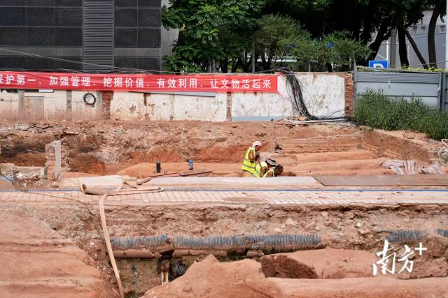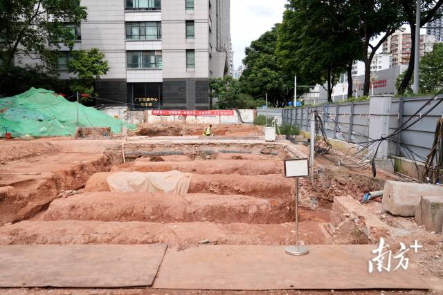 7月19日下午,记者来到“广州市轨道交通十三号线二期农林下路站”项目施工地,即原东风东路697号大院附近,记者看到现场有“文物发掘”的立牌和标识,工地上标语写着“保护文物,功在当代,利在千秋”。