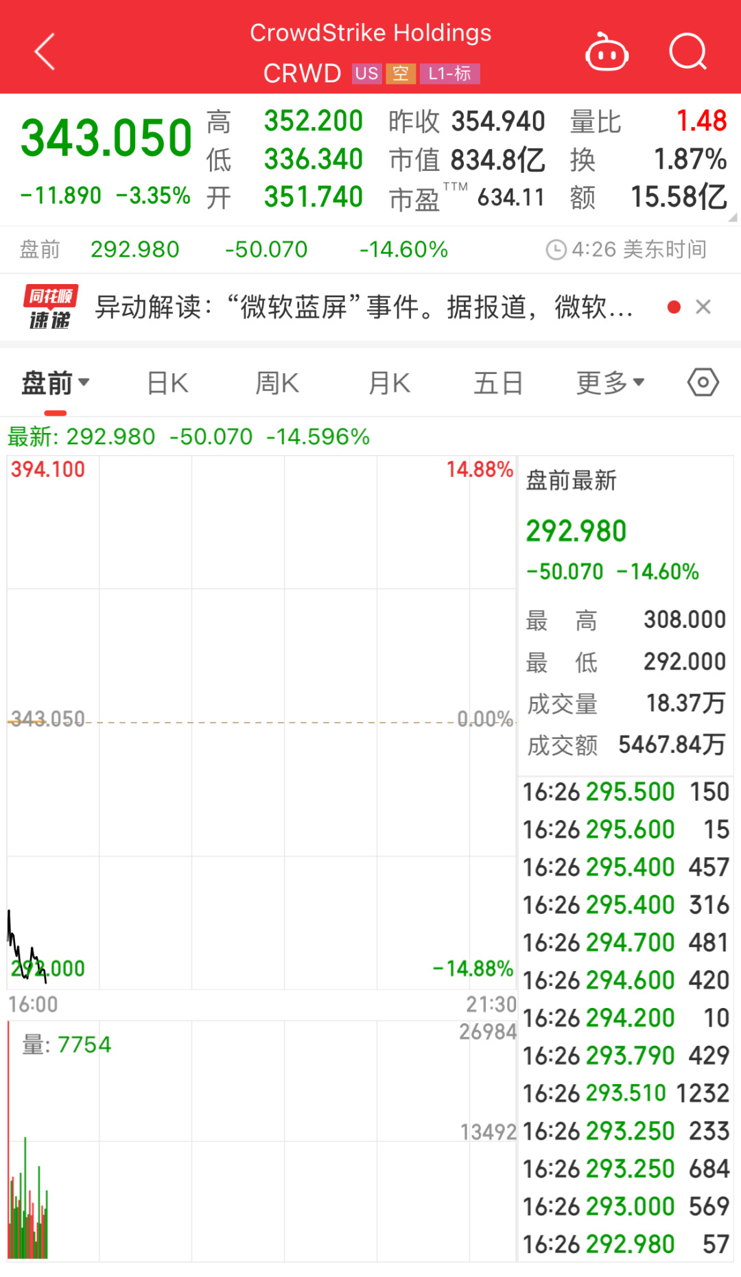 受消息影响,截至北京时间7月19日美股盘前,Crowdstrike股价跌超14%,微软盘前跌超2%。
