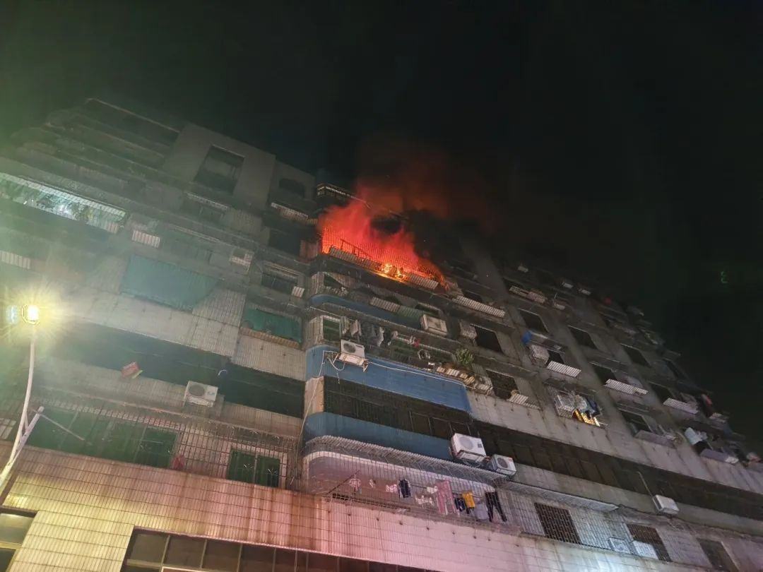7月17日凌晨2时16分,广州市119指挥中心接报称增城区前进路一居民楼发生火灾。接警后,广州市119指挥中心迅速调派辖区消防救援力量赶赴现场处置。消防救援人员抵达现场发现起火点位于第七层,火势正处于猛烈燃烧阶段,楼道内浓烟密布,屋内共有4名居民被困。此外,第八层还有两名约60岁的老人亟待救援。