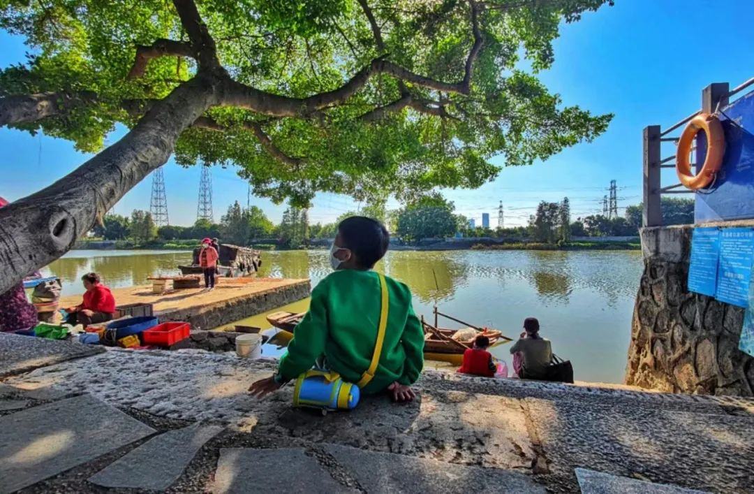 今黄埔古港边休憩的孩童与居民。