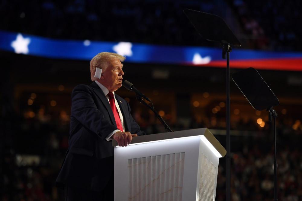 7月18日,美国前总统特朗普在密尔沃基的共和党全国代表大会上发表演讲。新华社记者李睿摄
