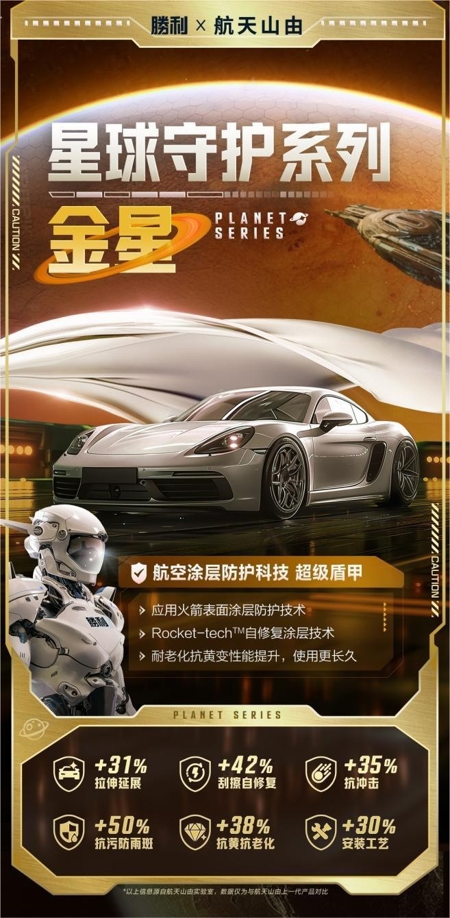 本次胜利携手航天山由在途虎养车平台首发的“星球守护系列”新品隐形车衣,便是洞察这一消费者需求后的诚意之作。在“星球守护系列”车衣中,无论是提供“顶配防护”的“金星”、或是堪称“超级盾甲”的“火星”、亦或是有“超韧柔甲”之称的“水星”,都将以超高的产品力,为广大车主提供饱含中国航天黑科技的至臻用车体验。