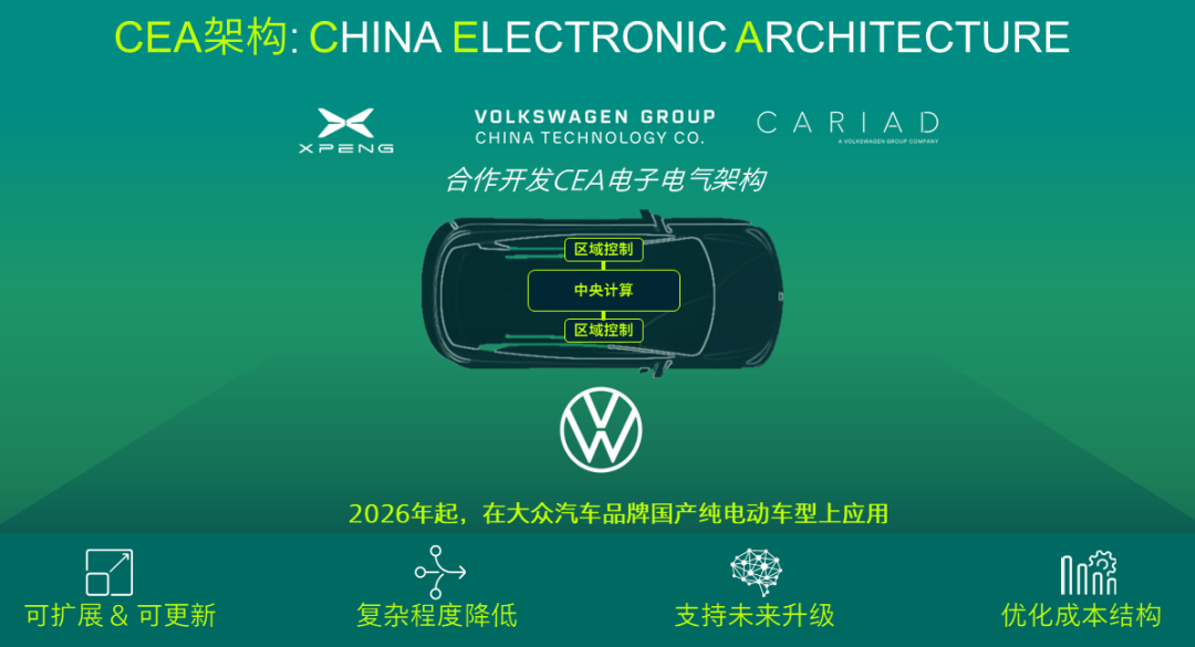 近年来,大众汽车加速在中国布局本地化软件开发,从2026年起,大众汽车品牌在华生产的纯电动车型将搭载中国本土化开发CEA电子电气架构。这一全新电子电气架构由大众汽车(中国)科技有限公司(VCTC)、CARIAD中国与小鹏汽车合作开发。CARIAD中国将在该项目中扮演关键角色,并为新架构研发集成最新一代的高级自动驾驶辅助方案(ADAS)以及智能座舱软件功能。据悉,大众汽车集团与小鹏汽车在7月22日签署了电子电气架构技术战略合作联合开发协议,推动大众汽车品牌在华纯电动车型向“软件定义汽车”转型。
