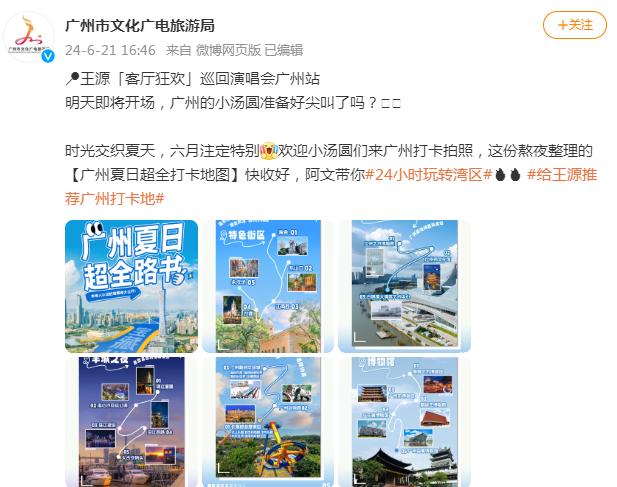6月21日,“广州市文化广电旅游局”微博号发布帖文称,“王源‘客厅狂欢’巡回演唱会广州站明天即将开场”,对演唱会进行宣传,并发布“广州夏日超全打卡地图”,包括跟有趣的人来一场“潮到风湿”的CityWalk——特色街区、新兴打卡点——广州新地标跟风成功、羊城之夜——原图直出的璀璨夜景、狂欢游乐园——玩水、滑雪直降10度、博物馆——坐上时光机穿梭千年羊城、乡村游——广州夏天的天花板在乡村、美食——星级打卡推荐、交通须知——广州“搭车”指南直接抄作业等吃住行超全攻略,欢迎小汤圆(王源粉丝名称)们来广州打卡。同时,加挂由@乐游广东(新浪广东站旅游频道官方微博)发起的话题#24小时玩转湾区#、#给王源推荐广州打卡地#,借力微博平台影响力及话题集聚效应,进一步提升传播力,获普通网民及王源粉丝群体肯定。如“广州文旅,你真的很不错,出批文也很快”“谢谢广州文旅,等我去打卡”“广州真好,谢谢这么贴心准备的游玩打卡攻略”“好全,对我们p人很友好”,实现文旅宣传与游客之间的双向互动,带动@广州市文化广电旅游局 互动力位居6月第5名。
