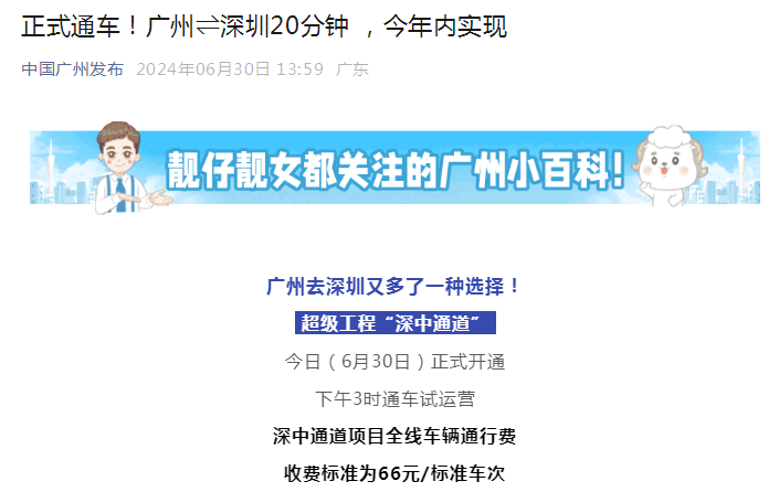 6月30日,“中国广州发布”微信公众号发布文章《正式通车!广州⇌深圳20分钟,今年内实现》,关注深中通道通车试运营,并重点介绍南中高速万顷沙支线建设进展。南中高速全线计划在今年建成通车,项目建成通车后,届时从南沙15分钟可至中山城区,20分钟内可抵达深圳。网民纷纷跟评表示,“万顷沙支线互通建设如火如荼”“以后南沙商务区的CBD出行留方便了”“通车之后感觉交通会便捷好多,大工程”。此外,该文章还称,深圳、香港的朋友周末选择深中通道去中山吃完乳鸽,再过来隔壁的广州“吃吃吃”,吃饱就去“行公园”,推广广州美食、景点,目前阅读量已超10万+。