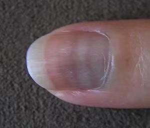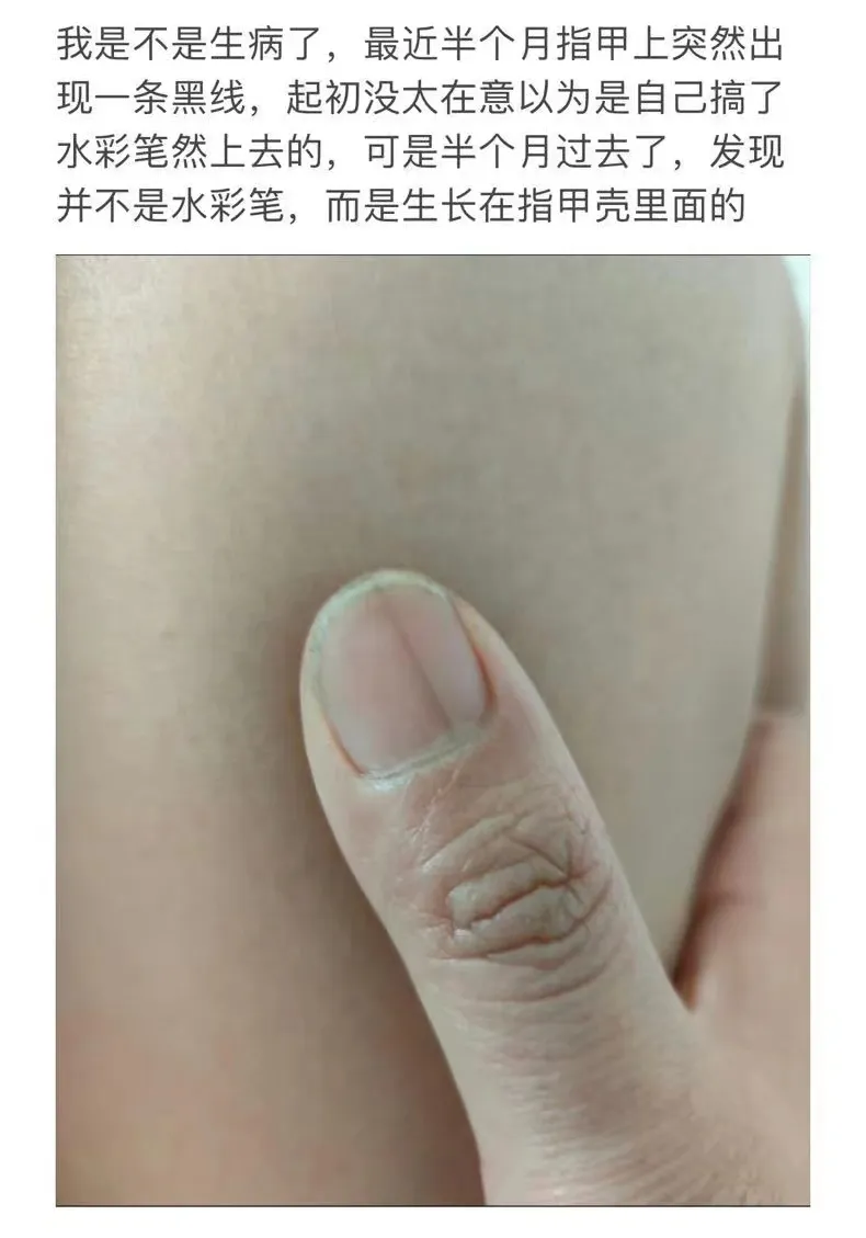 如果出现一条黑色的竖线贯穿指甲,就说明指甲的生长点(也就是甲母质)出了问题。