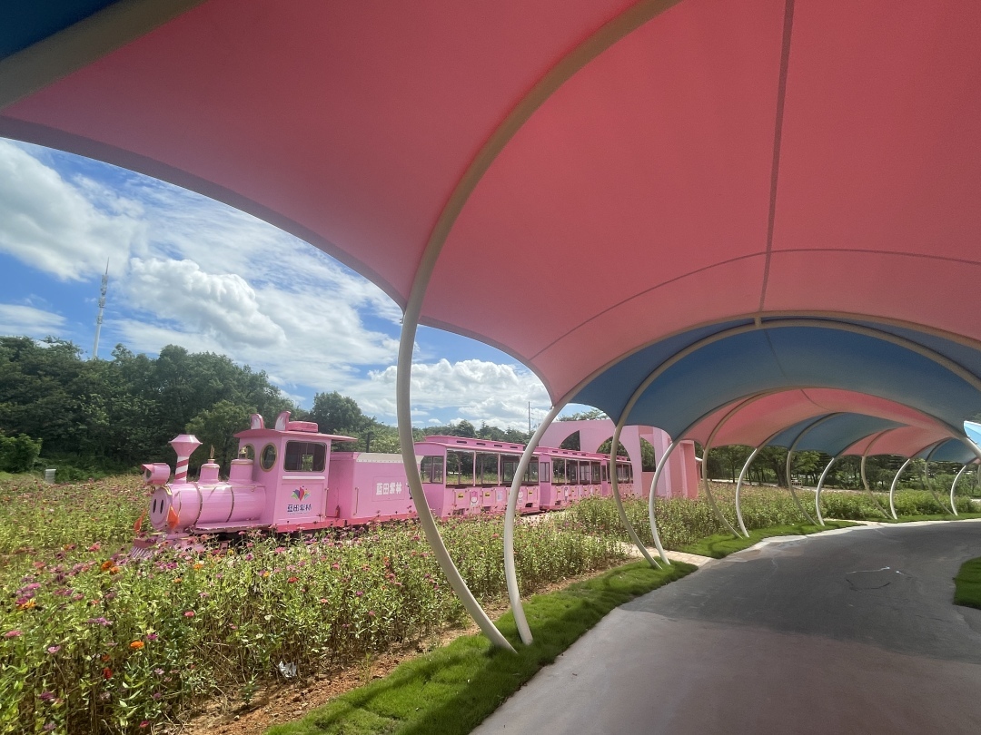 现在前往蓝田村游玩该项目,市民可以搭乘小火车,游览花海,并体验各种机动游戏。据悉,该项目以“绿”为手段,以“美”为目标,大力发展“乡村+绿化”“乡村+文旅”等业态,认种7262株苗木,培育格桑花、醉蝶花和薰衣草等花卉80亩。