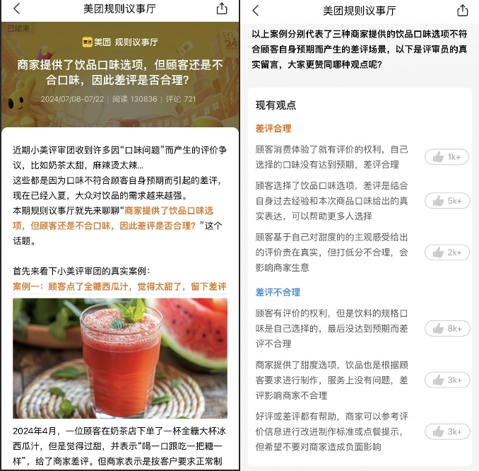 7月23日,记者从美团获悉,为更好解决此类用户和商家之间的争议纠纷,“美团规则议事厅”最近发起了“商家提供了饮品口味选择,但顾客还是不合口味,因此差评是否合理”话题讨论,向全体用户收集意见。