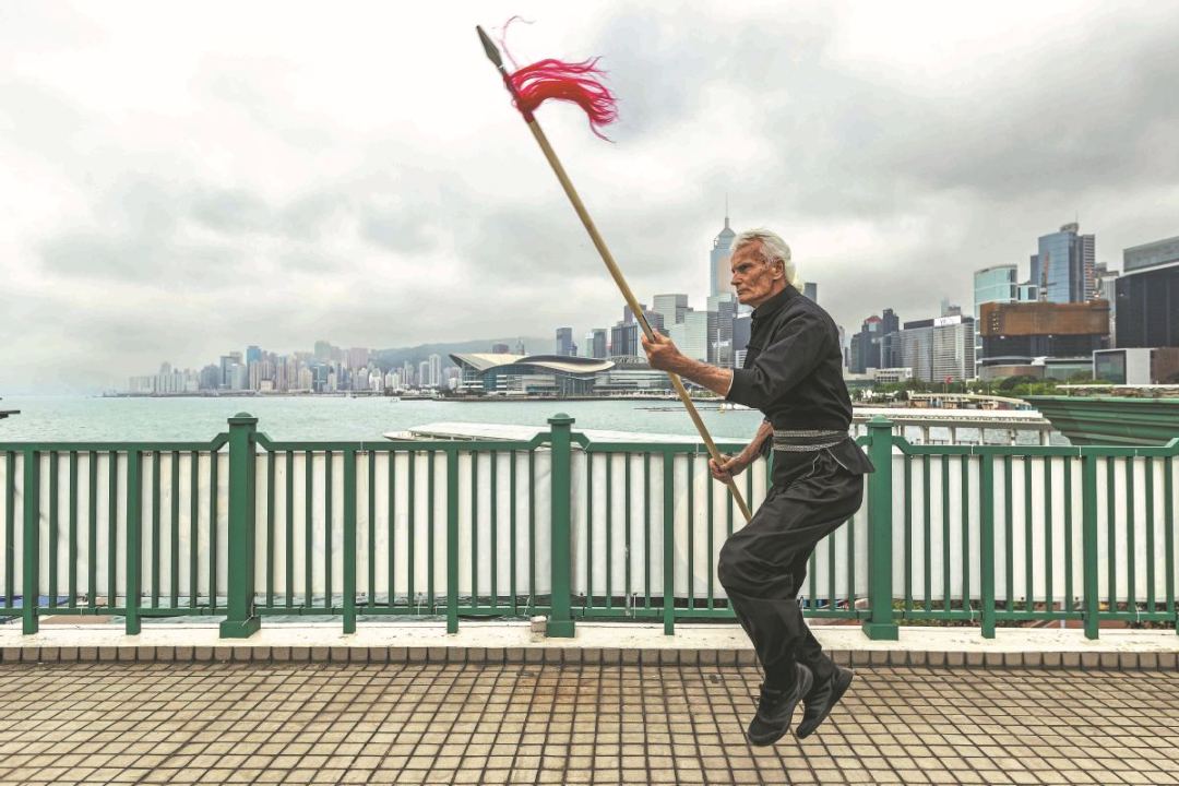 Gam Bok-Yin, a 77-year-old Australian who has practiced Hung Gar for more than six decades, trains using a red-tasselled spear at Victoria Harbor in Hong Kong. SUI PIU/FOR CHINA DAILY