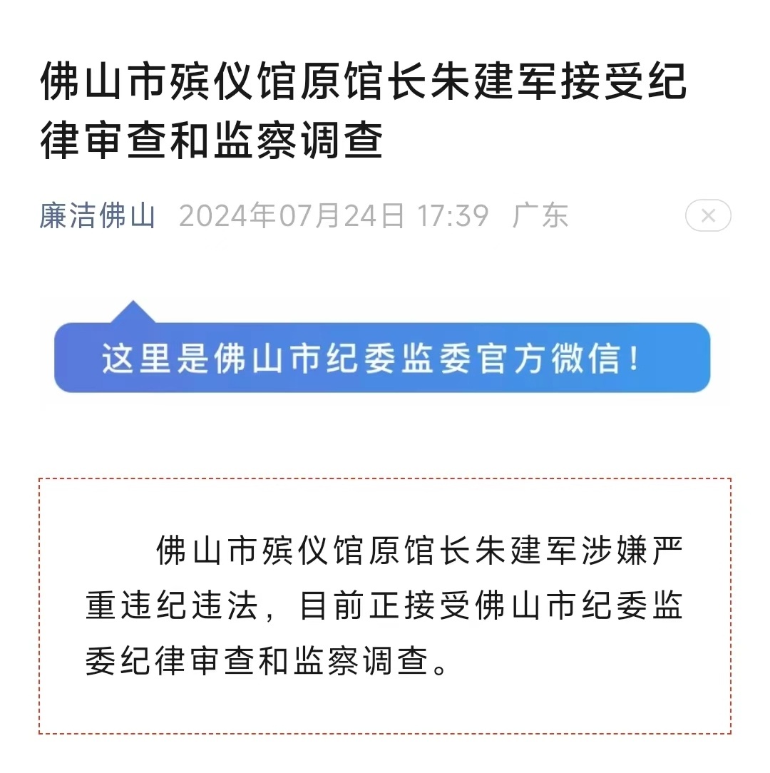 7月24日傍晚,佛山市纪委监委官方微信公众号“廉洁佛山”发布了最新消息:佛山市殡仪馆原馆长朱建军涉嫌严重违纪违法,目前正接受佛山市纪委监委纪律审查和监察调查。