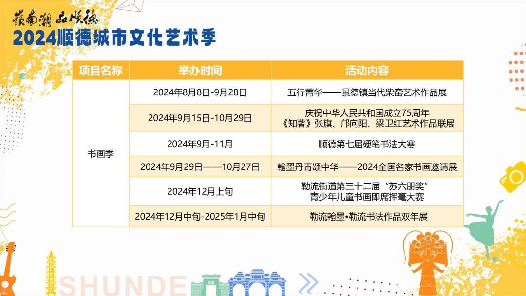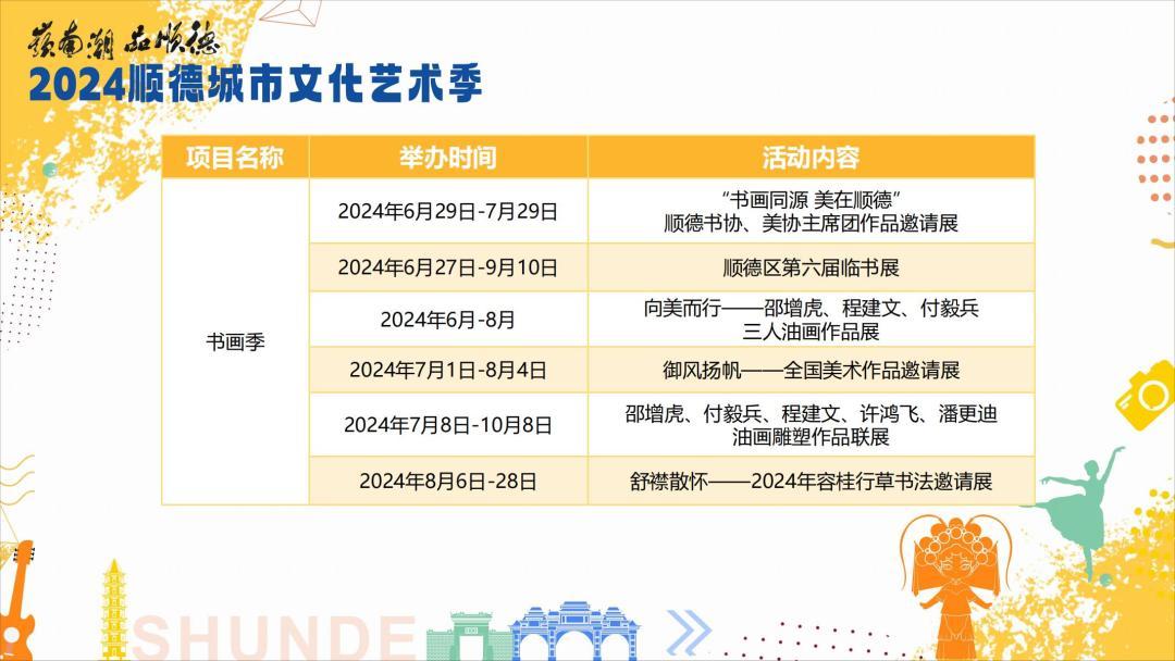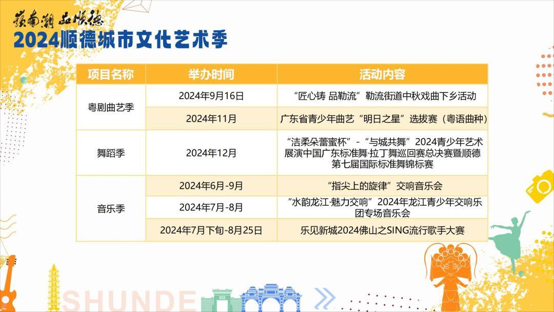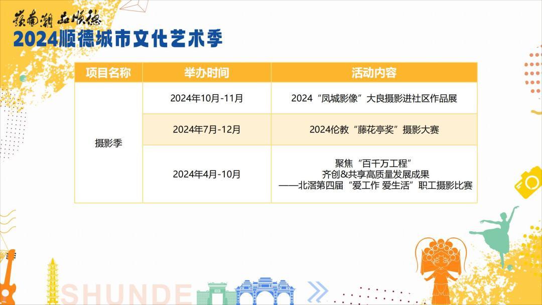 记者了解到,从2024年1月至2025年2月,顺德月月有活动,季季有特色,联动10个镇街、16个协会,资源互通,塑造品牌,更添精彩,总共分设“粤剧曲艺季、舞蹈季、音乐季、书画季、摄影季、文学季、综合类”七大门类,涵盖三十三项子项目,举办超百场活动,将合力奏响顺德城市文化最强音。具体活动包括:粤港澳粤曲创新创作征集展演活动、“顺德少年粤韵之星”粤剧曲艺新秀培养计划、“岭南潮 品顺德”顺德区舞蹈精品创作大赛、顺德青少年器乐展演暨校园葫芦丝专场、中国八大美院师生代表相约顺德画祠堂、水脉与村落交响·乡村振兴顺德摄影创作展、第十届“顺德杯”中国工业题材短篇小说创作大赛等。