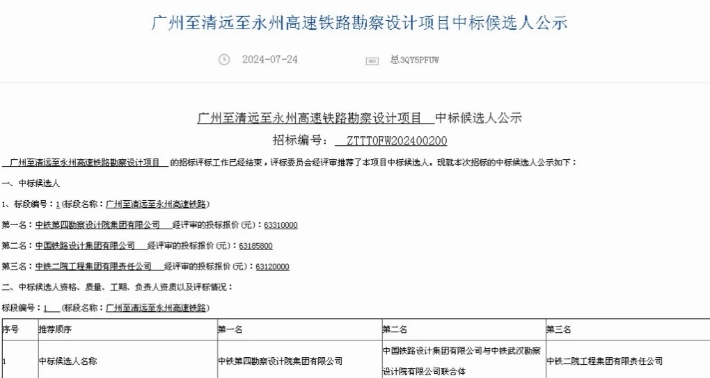 7月24日广州至清远至永州高速铁路勘察设计中标候选人公示发布。