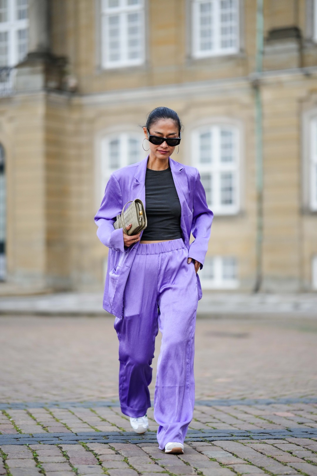 时尚博主Pornwika Spiecker身穿紫色休闲套装现身2024春夏哥本哈根时装周