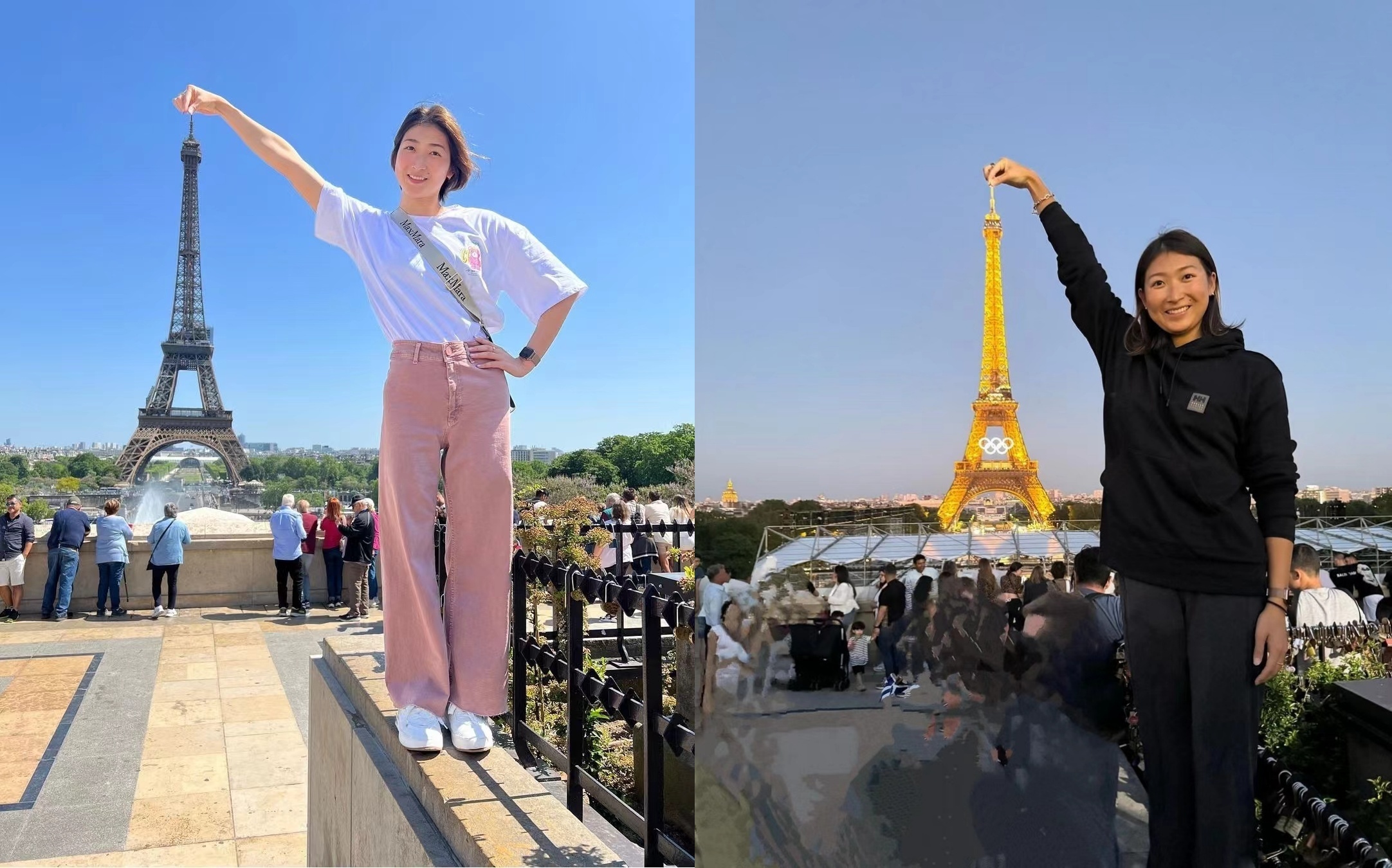 池江璃花子很喜欢以拎起塔尖的姿势与埃菲尔铁塔合影。左图拍摄于2023年5月,右图则拍摄于2024年6月。