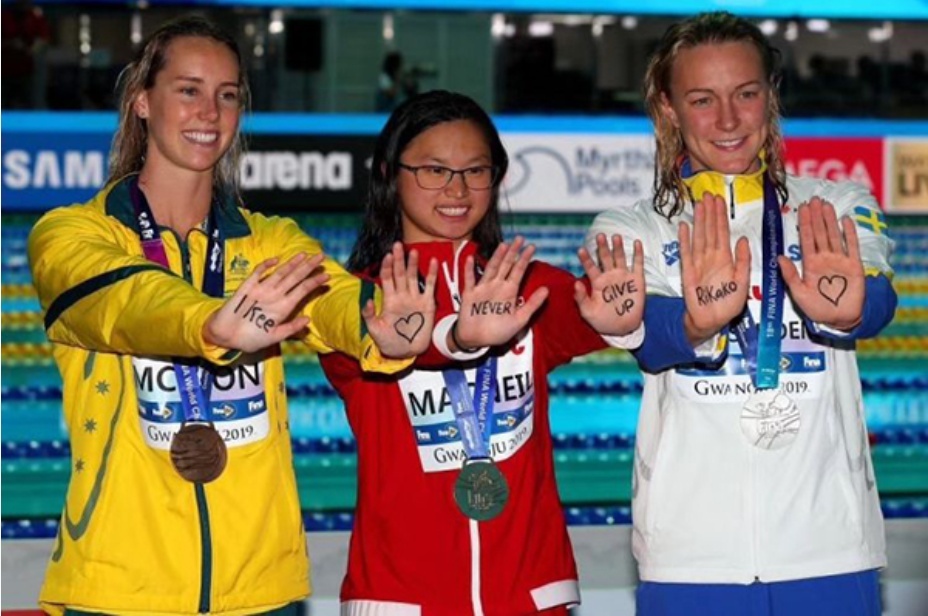 2019年光州世界游泳锦标赛,女子100米蝶泳前三名集体在掌心写字,支持池江璃花子。